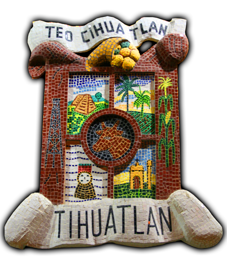 Es un cuadrado de piel, dividido en cuatro secciones con un círculo al centro. En la parte superior, una cinta ancha, doblada en tres partes, con las palabras: TEOCIUATLAN. Debajo de dicha cinta, en medio, un cuerno vaciando naranjas. En la Parte inferior una cinta donde aparece con letras mayúsculas, el nombre TIHUATLÁN. Al lado izquierdo aparece una torre de petróleo; al lado derecho una planta de maíz con espiga; en el círculo central, la figura de una vaca vista de frente. En la sección superior izquierda, se encuentra una pirámide parecida a la de Castillo de Teayo con una palmera en cada lado; en la sección superior derecha, una palmera y una planta de plátano con un racimo con su botella; en la sección inferior izquierda, aparece un escudo prehispánico circular, con plumas en la parte inferior y una greca en el centro como una espiral cuadrada. Unos pequeños triángulos en la parte alta; en la sección inferior derecha, se ve una iglesia con su campanario y una cruz en la parte superior.